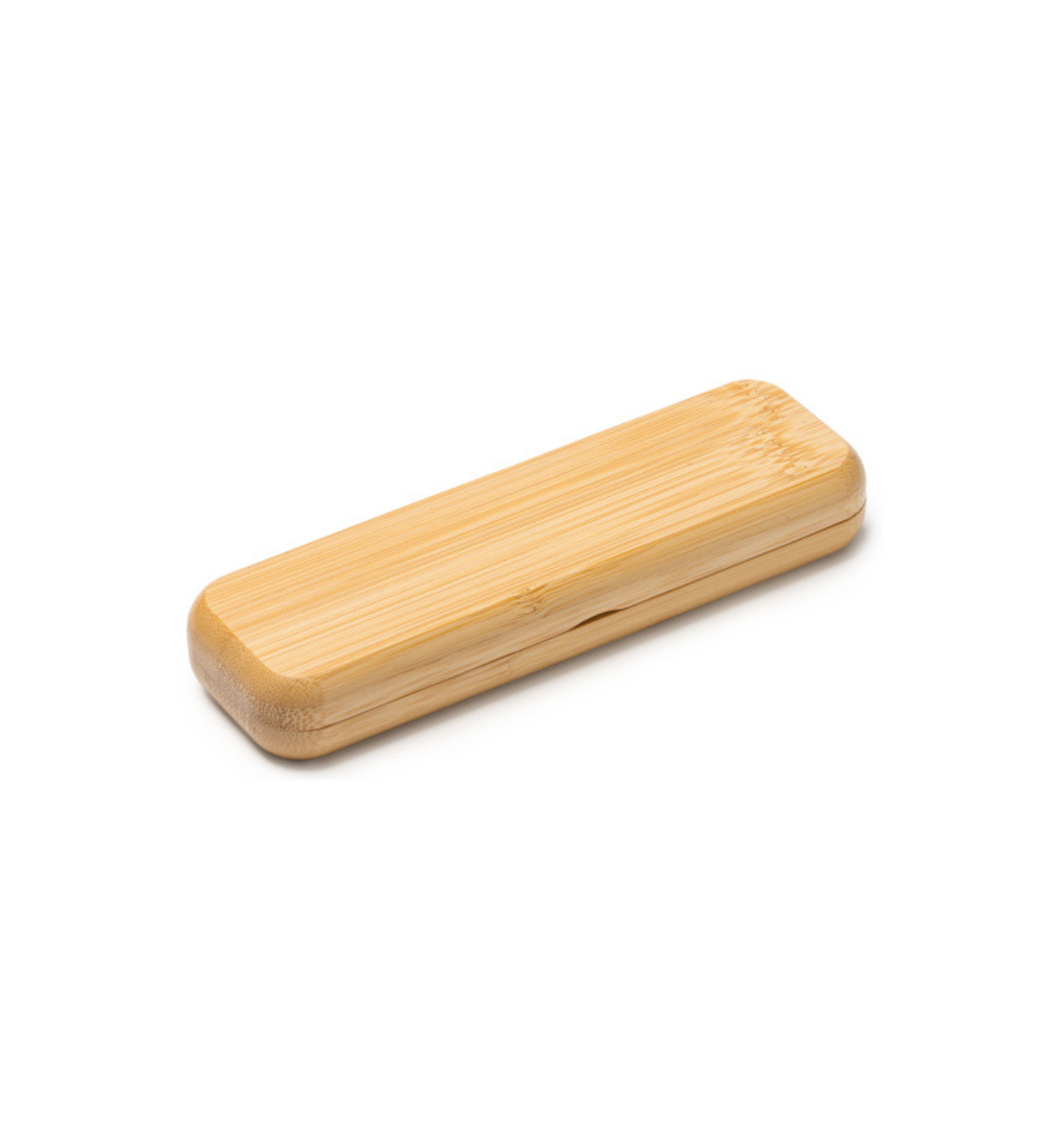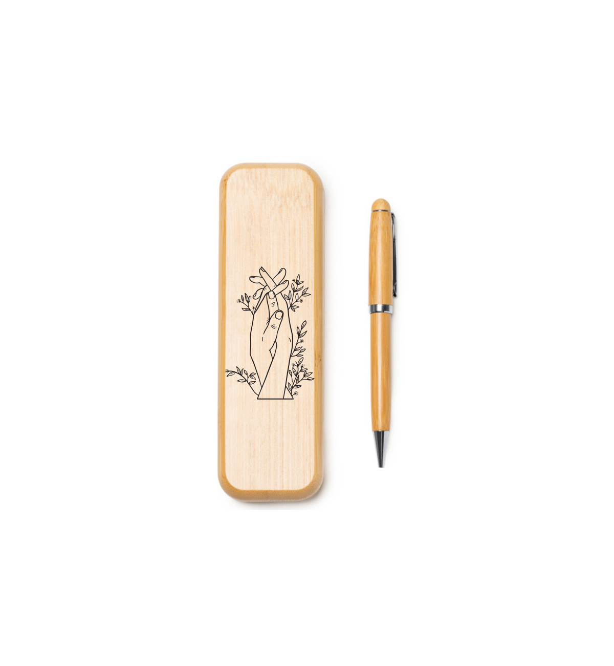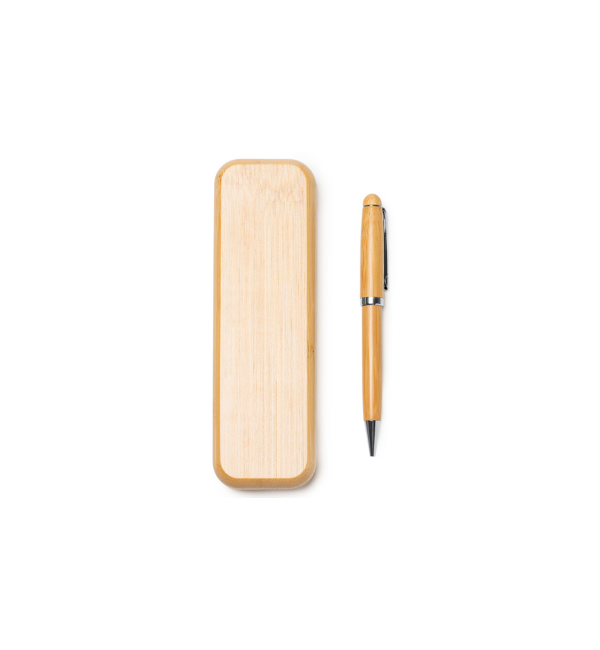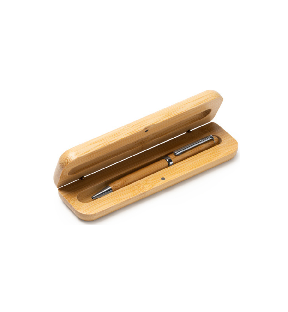 Bolígrafo giratorio realizado en bambú con detalles metálicos. Presentado en estuche de bambú con cierre magnético.