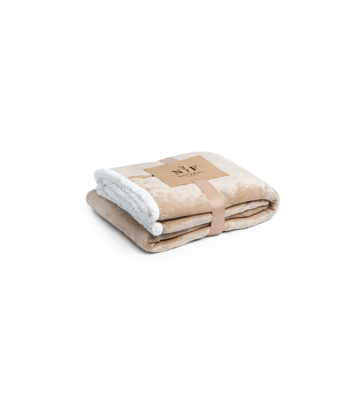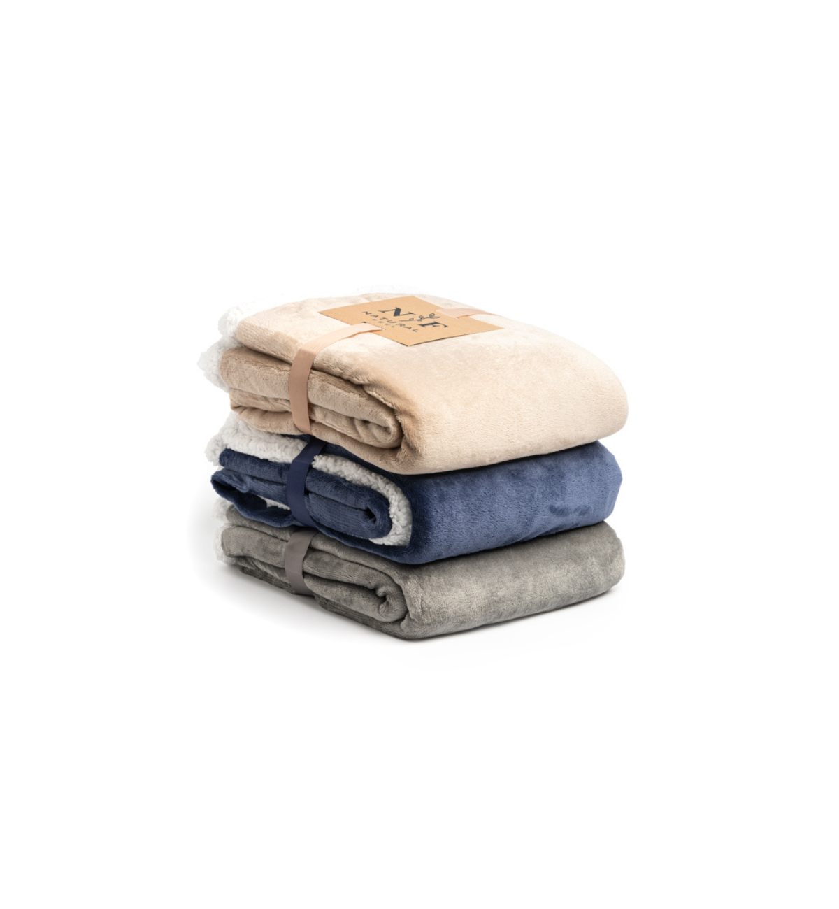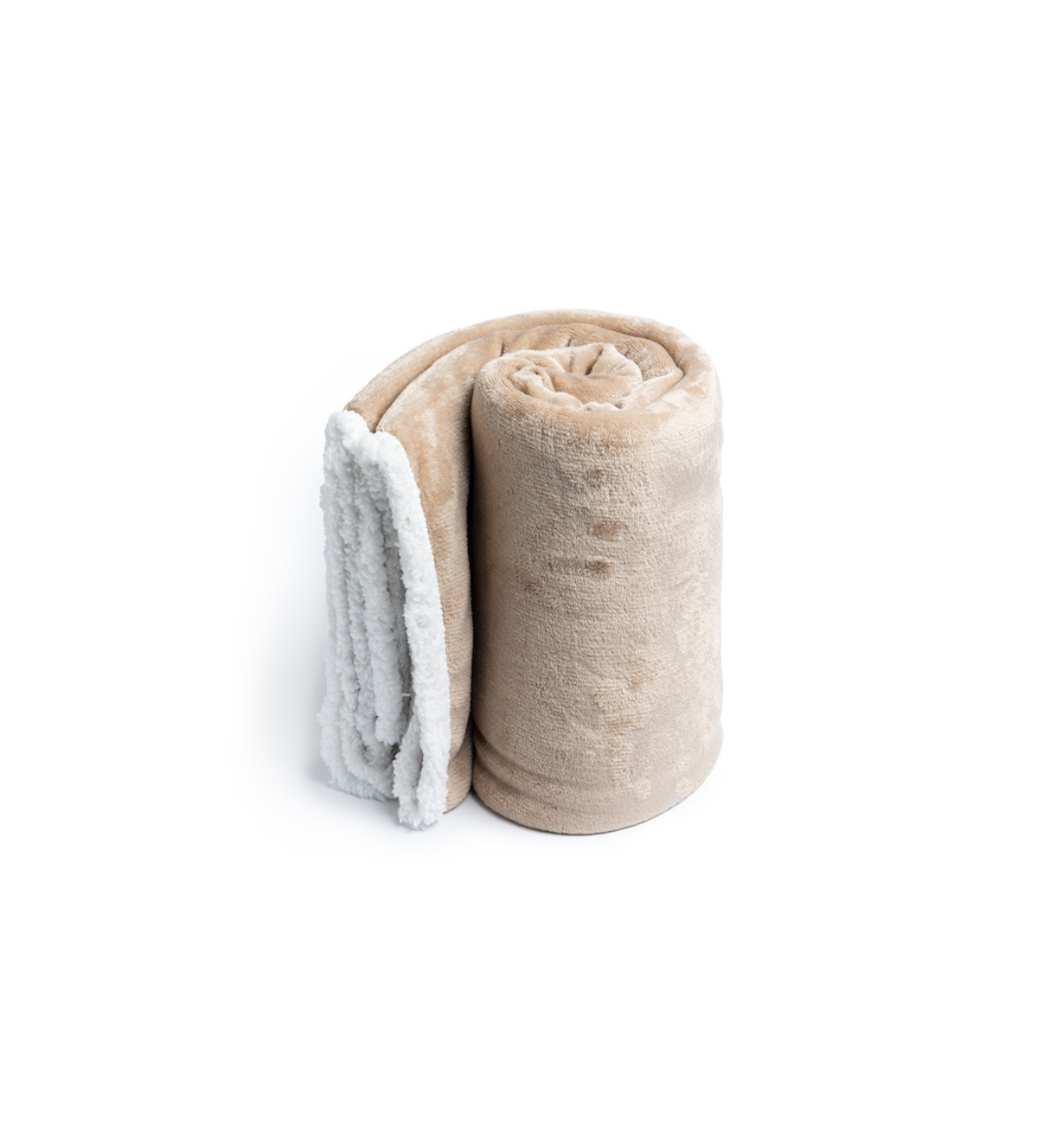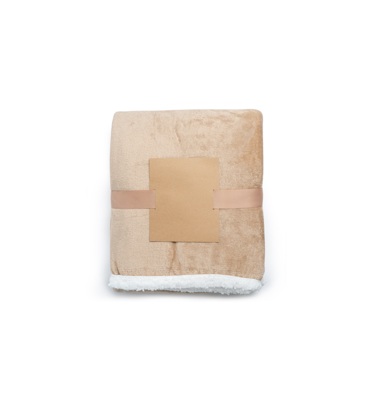 Manta polar de estilo Sherpa con polar fleece de 380 g/m². Incluye tarjeta ideal para marcaje y cinta de color a juego.
