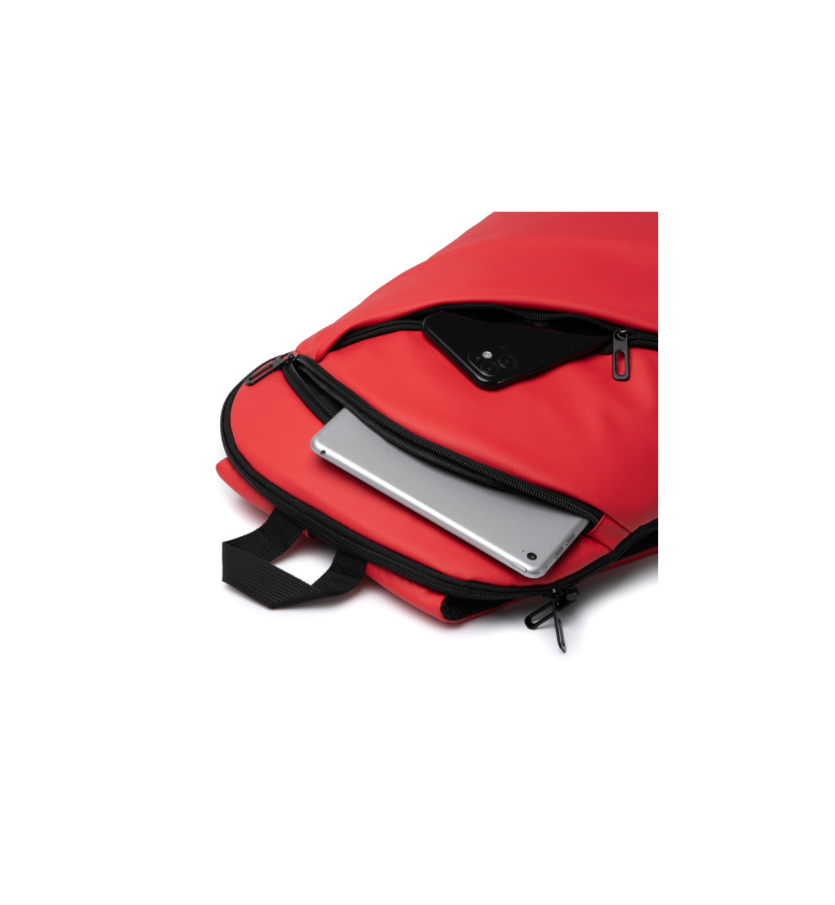 Mochila de PU Leather con compartimento principal y bolsillo elástico para portátil de 15". Dos bolsillos frontales con cierre de cremallera. Cinta para trolley. Asas y espalda acolchadas.