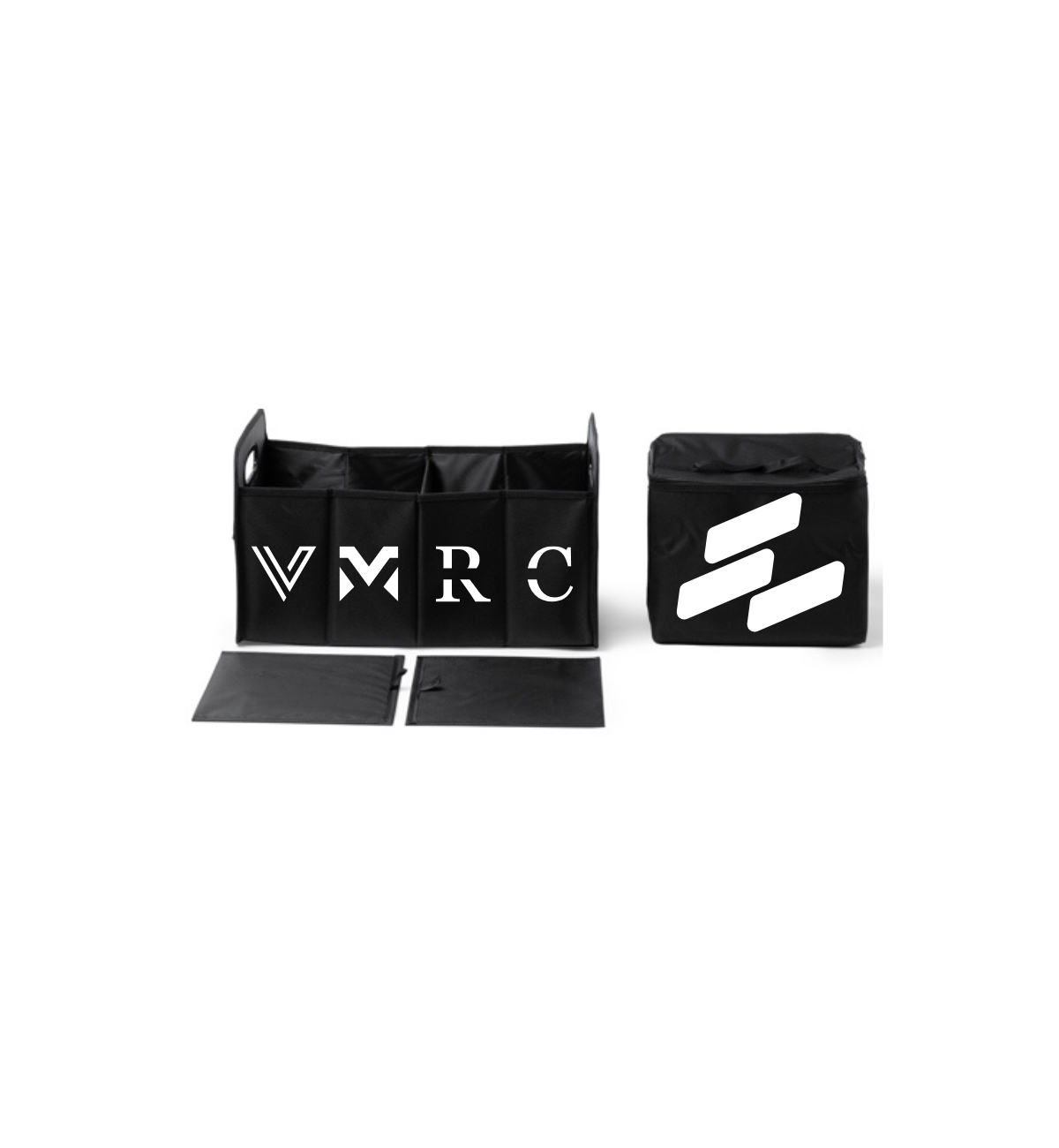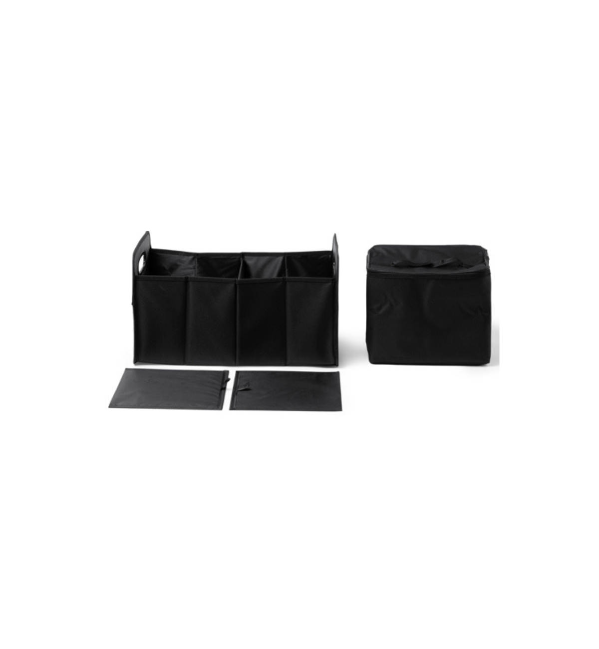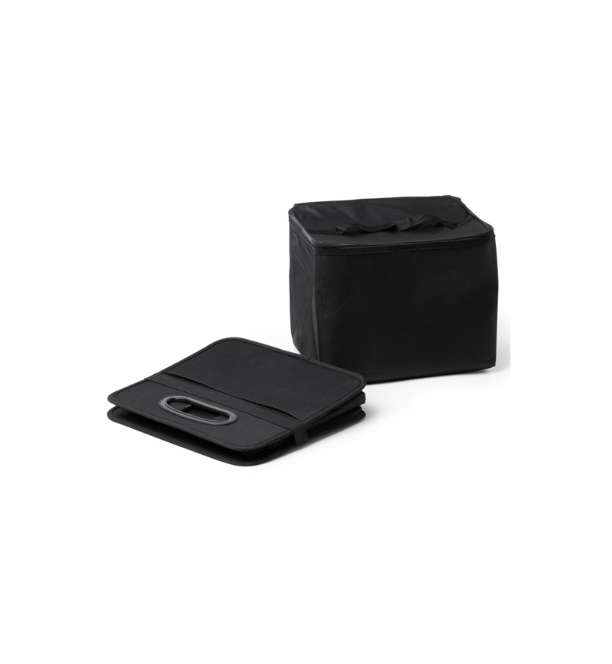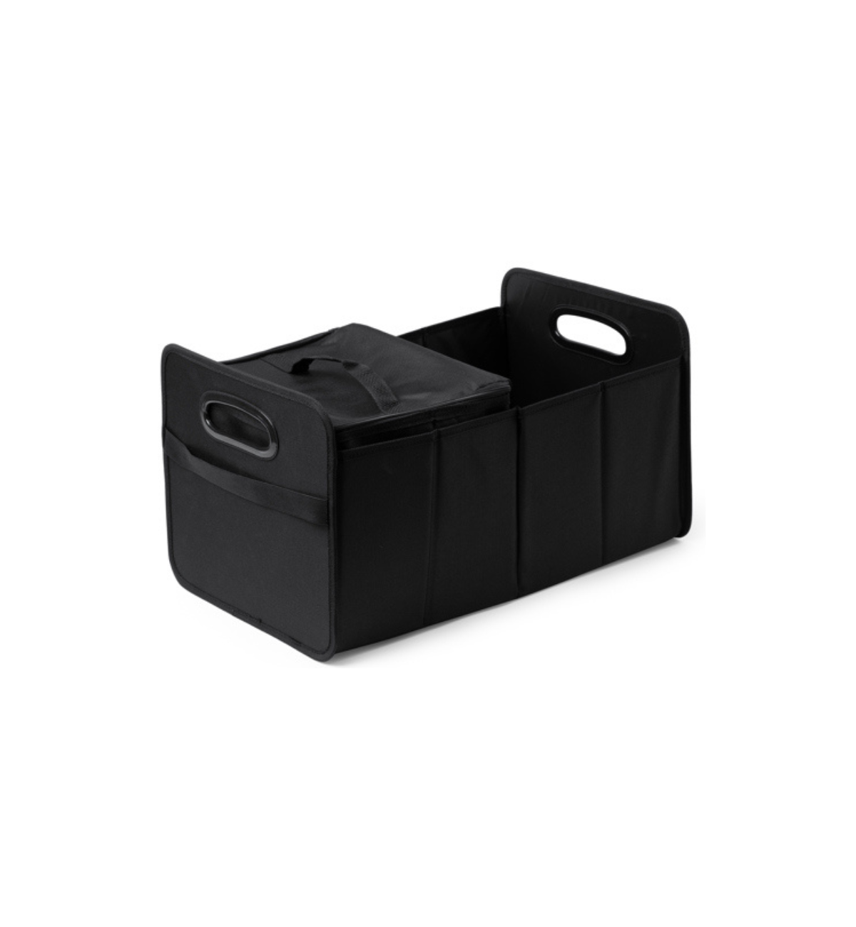 Organizador de maletero plegable con asas reforzadas. Realizado en poliéster 600D. 2 compartimentos principales y bolsillo exterior. Incluye nevera extraíble de 12L con interior isotérmico.
