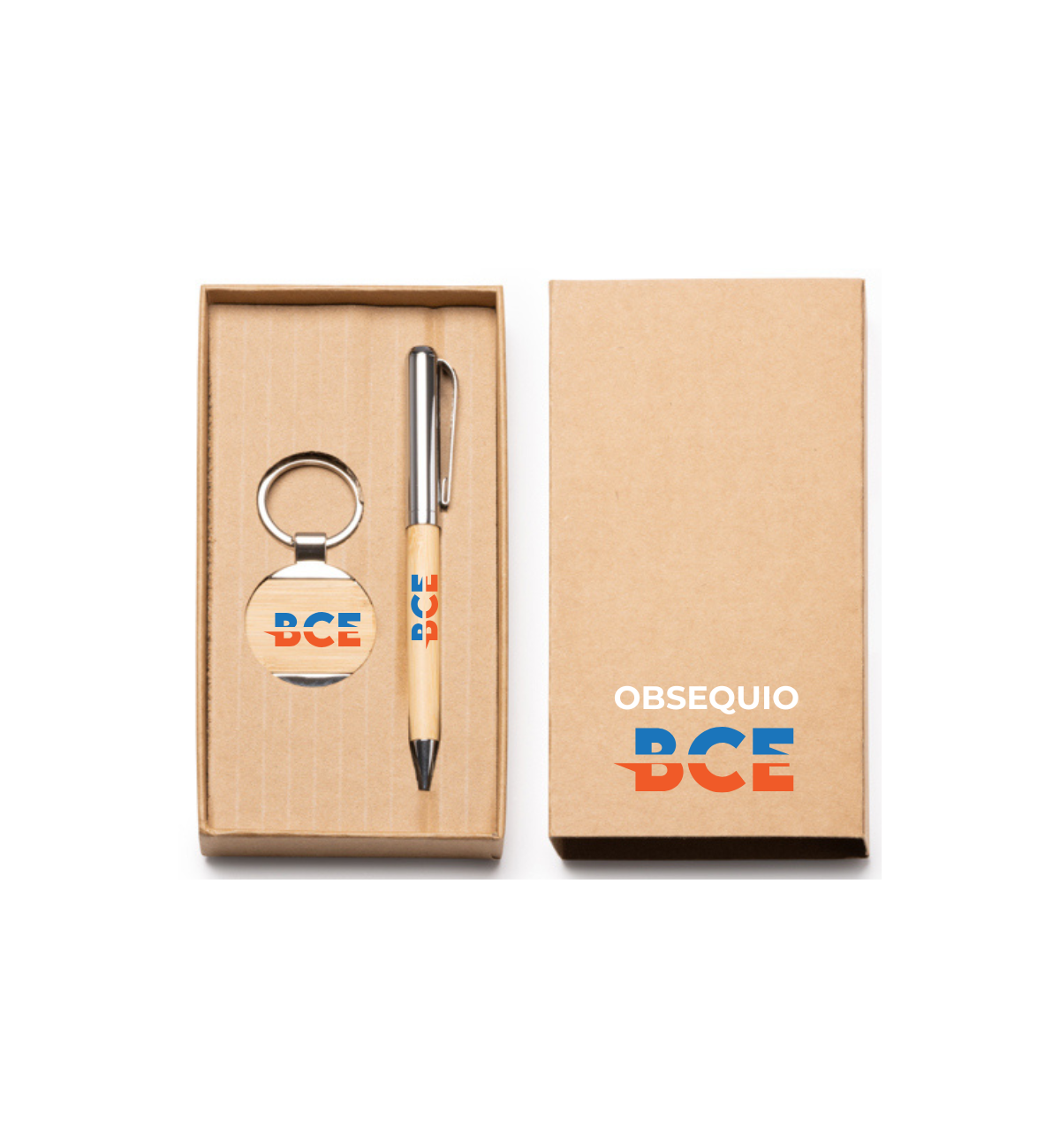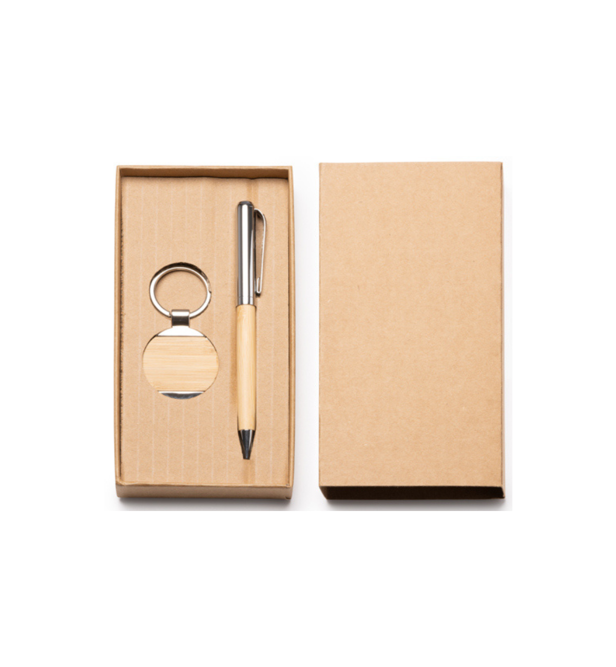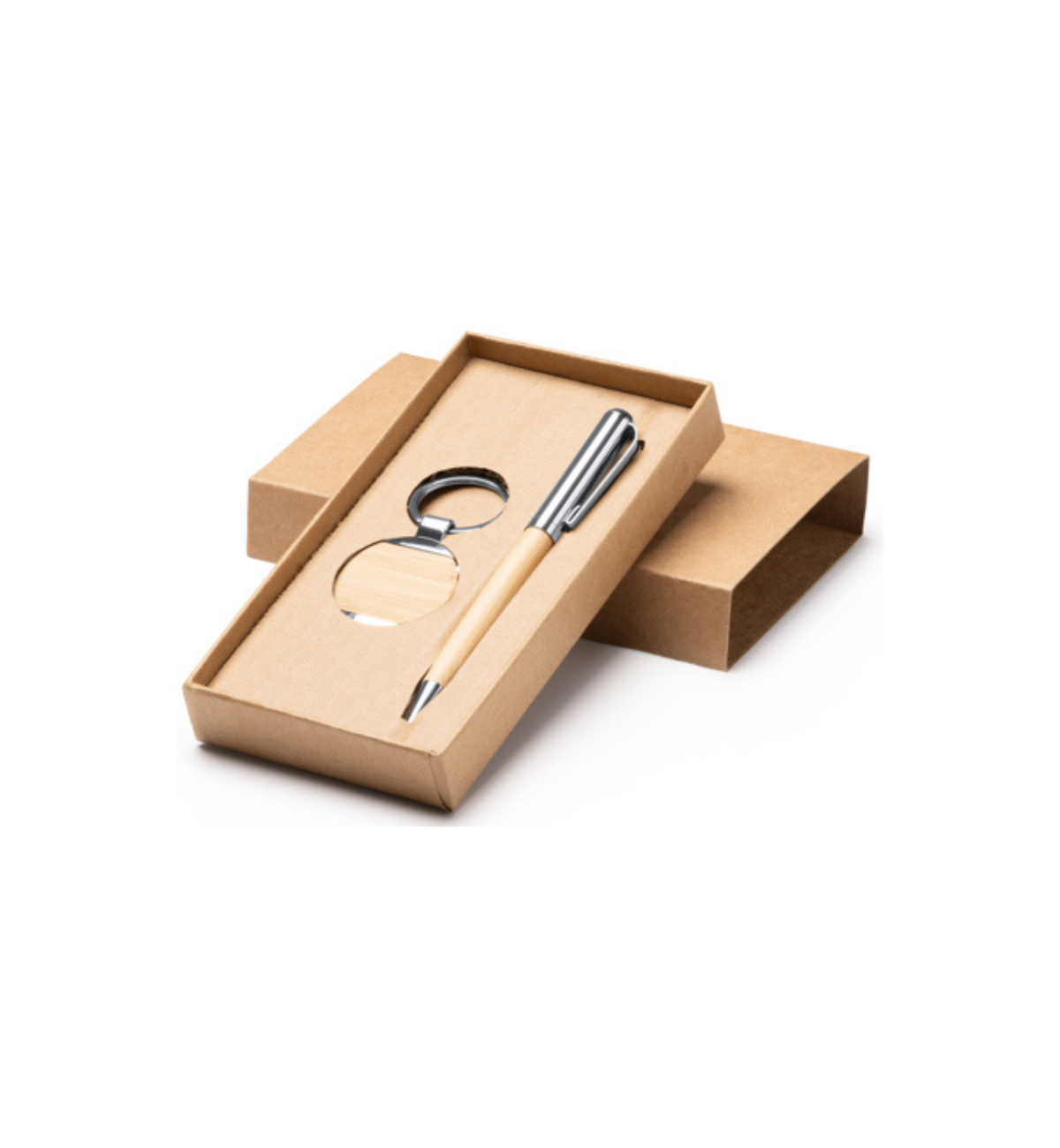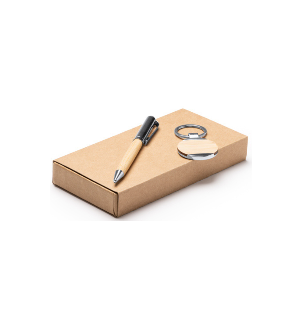 Set de bolígrafo y llavero de bambú con detalles metálicos. Tinta azul.